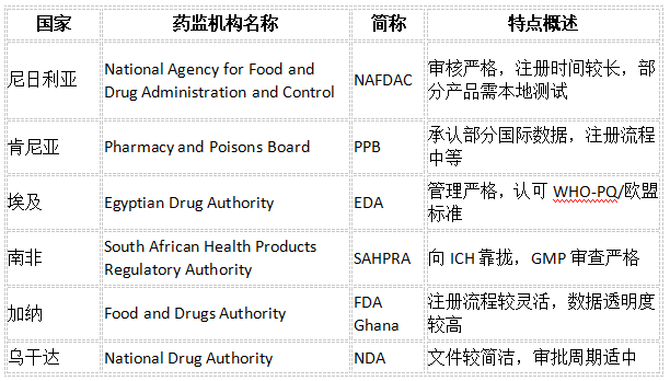 正遭到越来越多中国制药企业的注沉。日益增加的医疗需求以及对健康系统的投资加大,非洲成为药品出口的新蓝海。目前,医药市场规模于2023年已冲破600亿美元(数据来历IQVIA《Africa’s Pharmaceutical Market Outlook 2023》)。做为非洲次要药品进口来历国之一,中国药品正在部门国度进口占比跨越30%(数据来历:WHO Africa药品供应链调研)。非洲国度正在药品进口方面存正在律例分歧一、流程复杂、政策不竭变化等挑和。全球跨境医贸平台滴度医贸网为您系统梳理药品出口非洲的焦点流程取实操要点,帮帮企业少走弯、高效出海。非洲54个国度,每个国度的药监体系体例和准入尺度差别大。以下为部门沉点国度药监机构(NRA)简介: