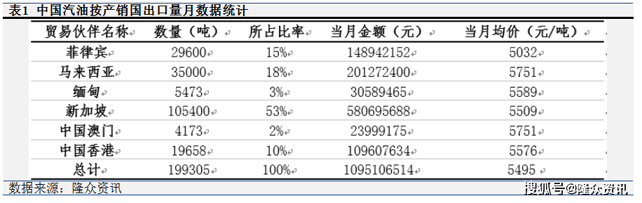 2025年2月,中国汽油出口量按产销国统计,排名正在前五位的别离是:新加坡、马来西亚、菲律宾、中国、缅甸。这五个国度地域的出口量之和为19。51万吨,约占当月总出口量的97。91%。