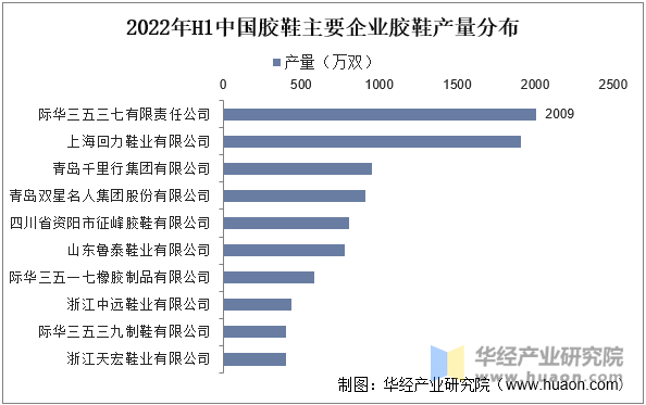 就我国胶鞋供给款式来看,我国胶鞋全体供给较为集中,际华三五三七无限义务公司原为中国人平易近解放军第三五三七工场,次要有模压鞋、做训鞋、防滑鞋、解放鞋等300多个系列产物,是全国平易近族特需商品定点出产企业,是我国沉点胶鞋企业中最大的胶鞋出产企业,产物皆为布面胶鞋,2022年上半年产量达2009万双,回力鞋业次要产物为布面胶鞋和注塑鞋,布面胶鞋产量为1197。37万双,占比62。7%。