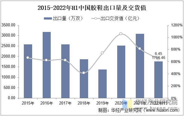 就我国胶鞋出口环境,我国是全球最大的的胶鞋出产国之一,每年出口量正在万万双以上,数据显示,近年来我国胶鞋出口全体表示为先升后降再回升态势,数据显示,2021年我国胶鞋出口量和出货值别离为3084。94万双和8。09亿元,2022年上半年胶鞋出口量和出货值别离为1756。46万双和6。45亿元,别离较2021年同期增加31。34%和45。53%。