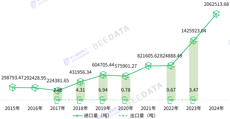 从进出口商业量来看,中国榴莲进口量增加了1763720。21吨(约合176。37万吨),增幅约为590。28%,年均复合增加率约为23。94%;近十年间中国仅正在2017年~2020年、2022年~2023年6年有榴莲出口,中国榴莲进出口商业常年呈净进口态势;且因为2015年、2024年,中国均无榴莲出口,中国榴莲净进口量及净进口金额取榴莲进口量及进口金额的增幅取增速均连结分歧。