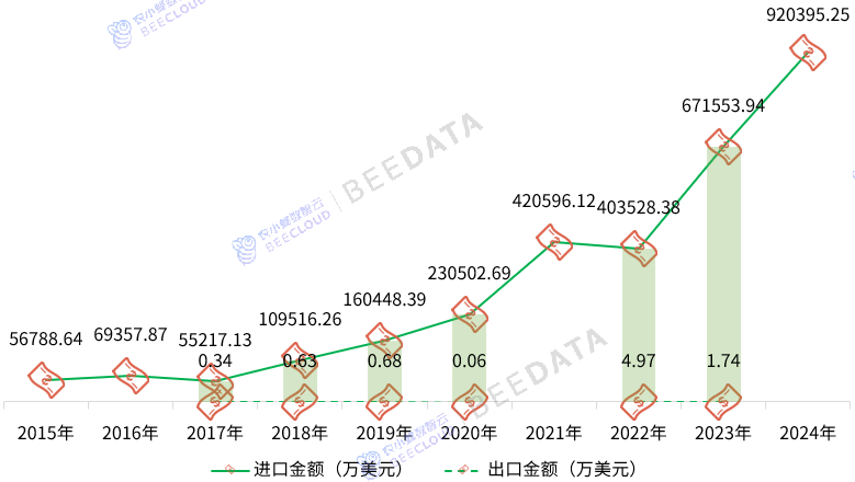2015年至2024年,中国榴莲进口金额增加了863606。61万美元(86。36亿美元);中国榴莲商业逆差取进口金额变化趋向连结分歧。