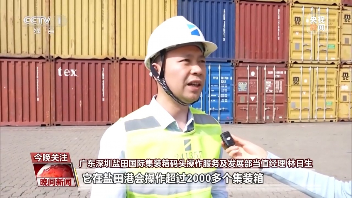 盐田国际集拆箱船埠操做办事及成长部当值司理 林日生:这是去往美国的一艘船,它正在盐田港会操做跨越2000多个集拆箱。其他船公司全数都正在协调船埠来调靠泊位,船埠每天都有6班船舶去往美国。
