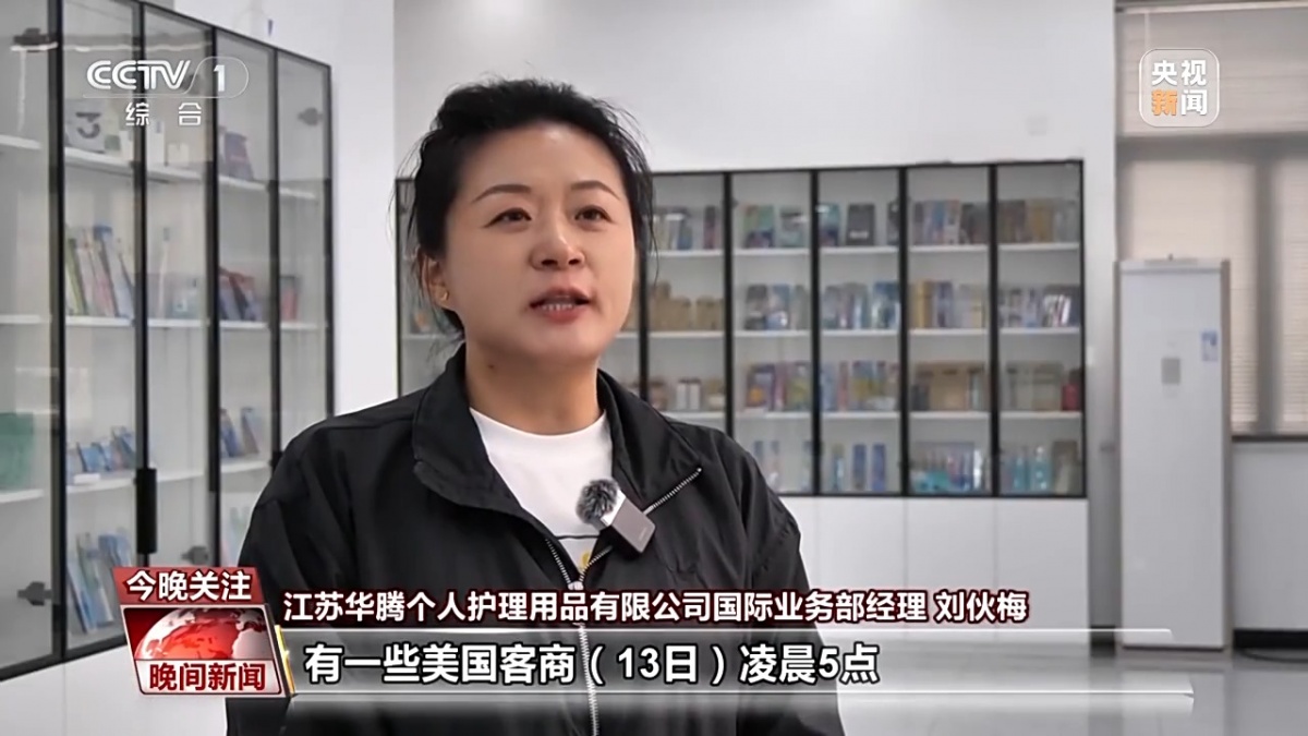 江苏华腾小我护理用品无限公司国际营业部司理 刘伙梅:有一些美国客商13日凌晨5点间接发来新订单的设想,我们正在收到设想当前,第一时间放置打样出产,首批订单估计正在5月20日摆布就能够发货。
