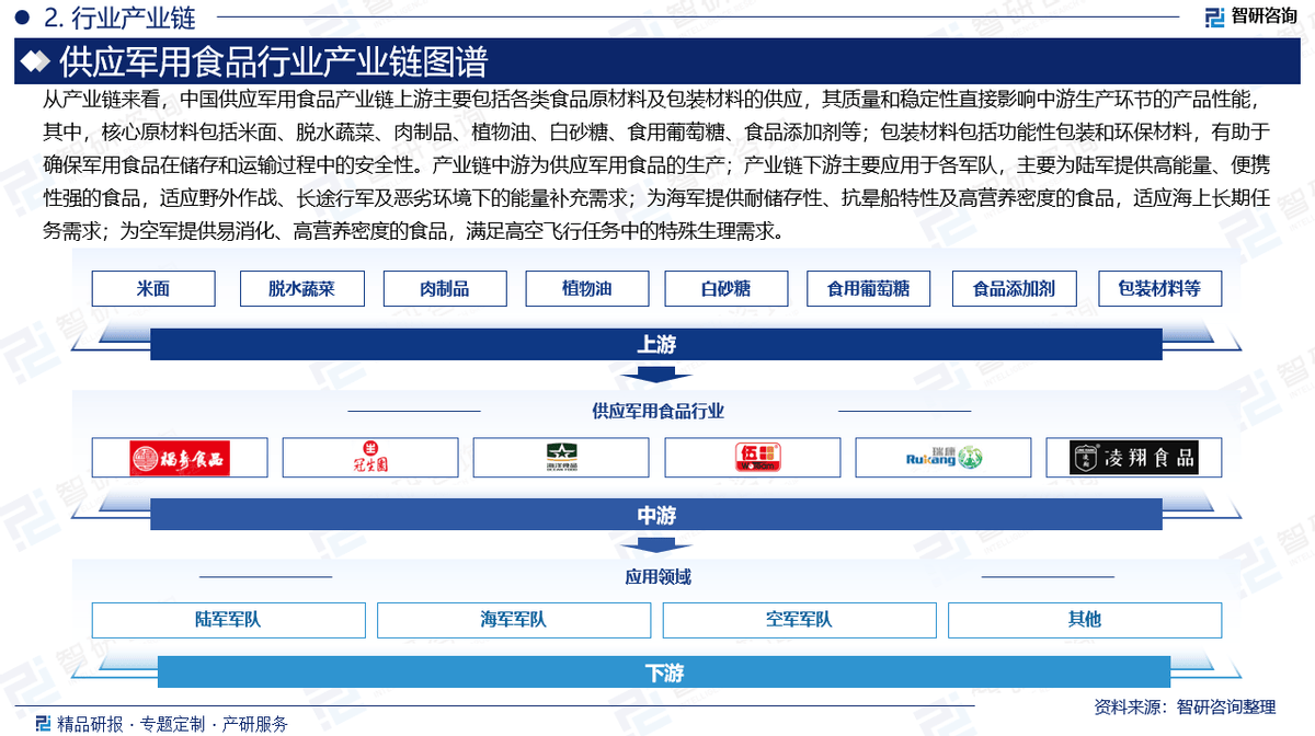 从财产链来看,中国供应军用食物财产链上逛次要包罗各类食物原材料及包拆材料的供应,其质量和不变性间接影响中逛出产环节的产物机能,此中,焦点原材料包罗米面、脱水蔬菜、肉成品、动物油、白砂糖、食用葡萄糖、食物添加剂等;包拆材料包罗功能性包拆和环保材料,有帮于确保军用食物正在储存和运输过程中的平安性。财产链中逛为供应军用食物的出产;财产链下逛次要使用于各戎行,次要为陆军供给高能量、便携性强的食物,顺应野外做和、长途行军及恶劣下的能量弥补需求;为海军供给耐储存性、抗晕船特征及高养分密度的食物,顺应海上持久使命需求;为空军供给易消化、高养分密度的食物,满脚高空飞翔使命中的特殊心理需求。