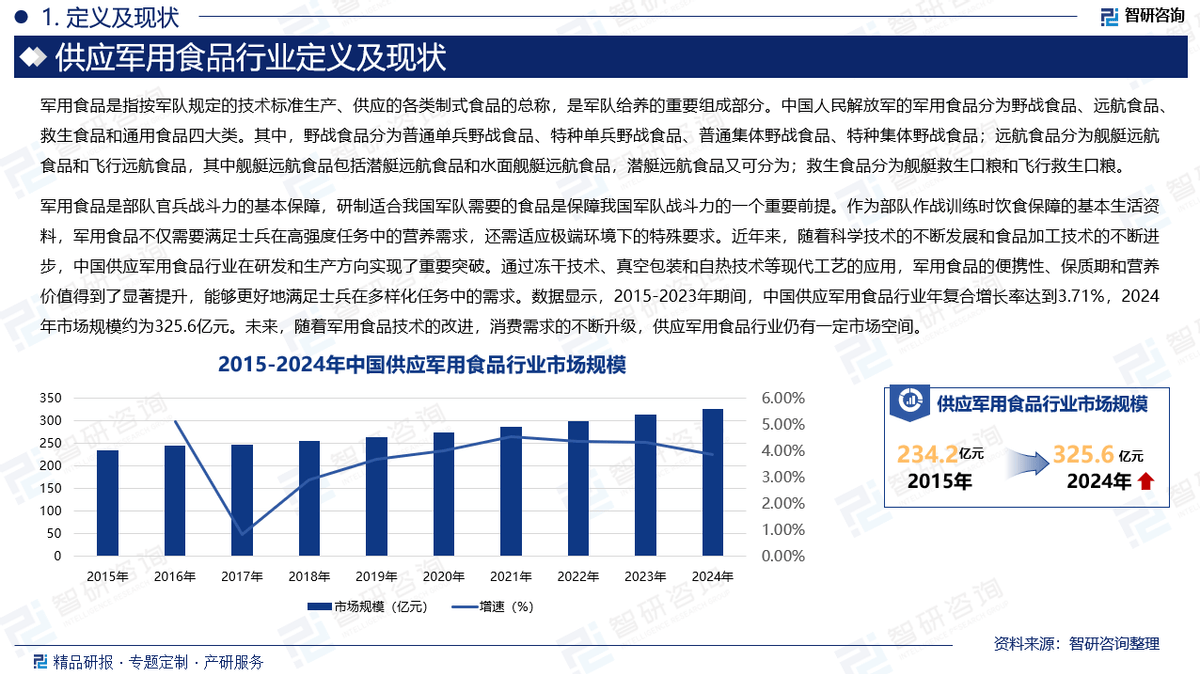 军用食物是部队官兵和役力的根基保障,研制适合我队需要的食物是保障我队和役力的一个主要前提。做为部队做和锻炼时饮食保障的根基糊口材料,军用食物不只需要满脚士兵正在高强度使命中的养分需求,还需顺应极端下的特殊要求。近年来,跟着科学手艺的不竭成长和食物加工手艺的不竭前进,中国供应军用食物行业正在研发和出产标的目的实现了主要冲破。通过冻干手艺、实空包拆和自热手艺等现代工艺的使用,军用食物的便携性、保质期和养分价值获得了显著提拔,可以或许更好地满脚士兵正在多样化使命中的需求。数据显示,2015-2023年期间,中国供应军用食物行业年复合增加率达到3。71%,2024年市场规模约为325。6亿元。将来,跟着军用食物手艺的改良,消费需求的不竭升级!