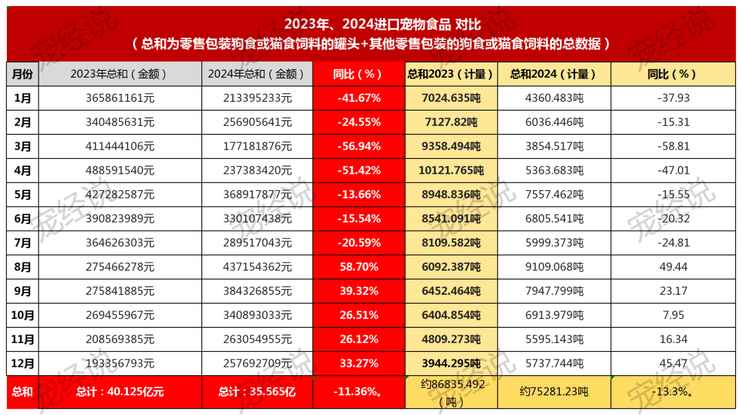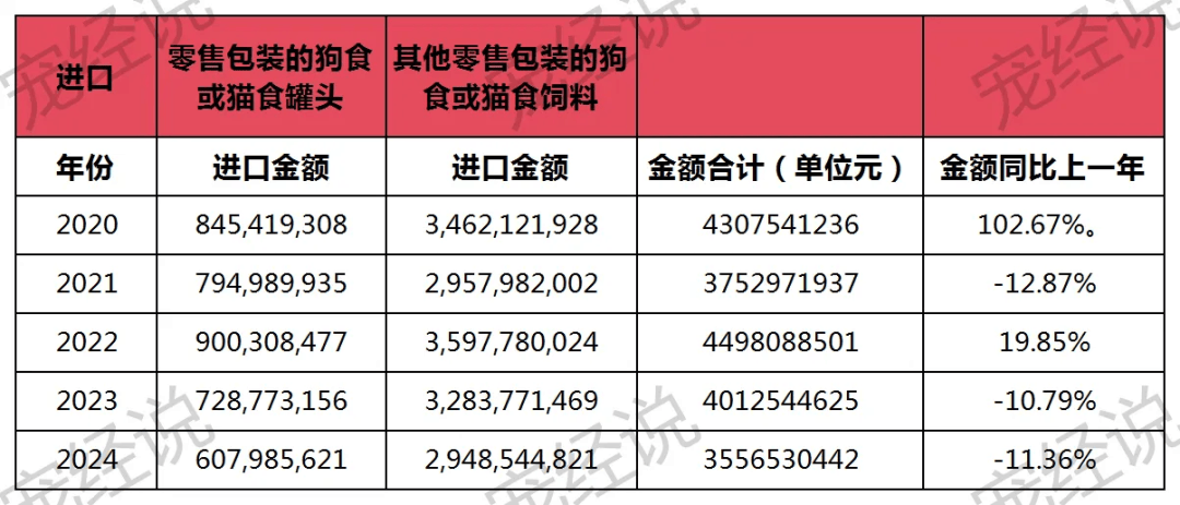 现实上,早正在中方加征关税动静落地之前,进口宠物食物市场便已尽显疲态。海关总署数据显示,2024年的12个月,有7个月进口总值都呈下滑趋向,正在进口金额上则同比2023年下降了4。56014183亿。我国宠物食物(其他零售包拆的狗食或猫食饲料及零售包拆狗食或猫食饲料的罐头总和)累计进口量为75281。238 吨,同比下滑13。41%;累计进口金额为35。565亿元,对比2023年削减了4。56亿元。
